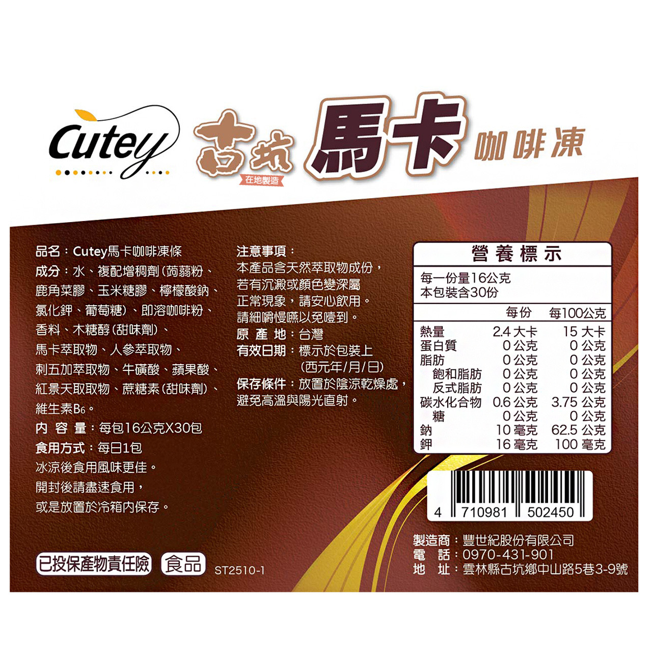 ▲營養標示:「請參考圖片」 🌈【Cutey-古坑咖啡凍】提神專用👶🍇 ✅ 產品特色: 🧊 果凍型態,咀嚼好入口、無吞嚥困難 🌟 每日營養補給好輕鬆 《內 容 量》 ✽每包16公克。 《有效日期》 ✽如包裝標示。 《食用方法》✽每天1-3包。